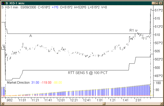 The above chart is a 5-minute bar chart of the S&P futures, where the prior DOW chart was for March 9th, 2000, this S&P chart is for March 8th, 2000.